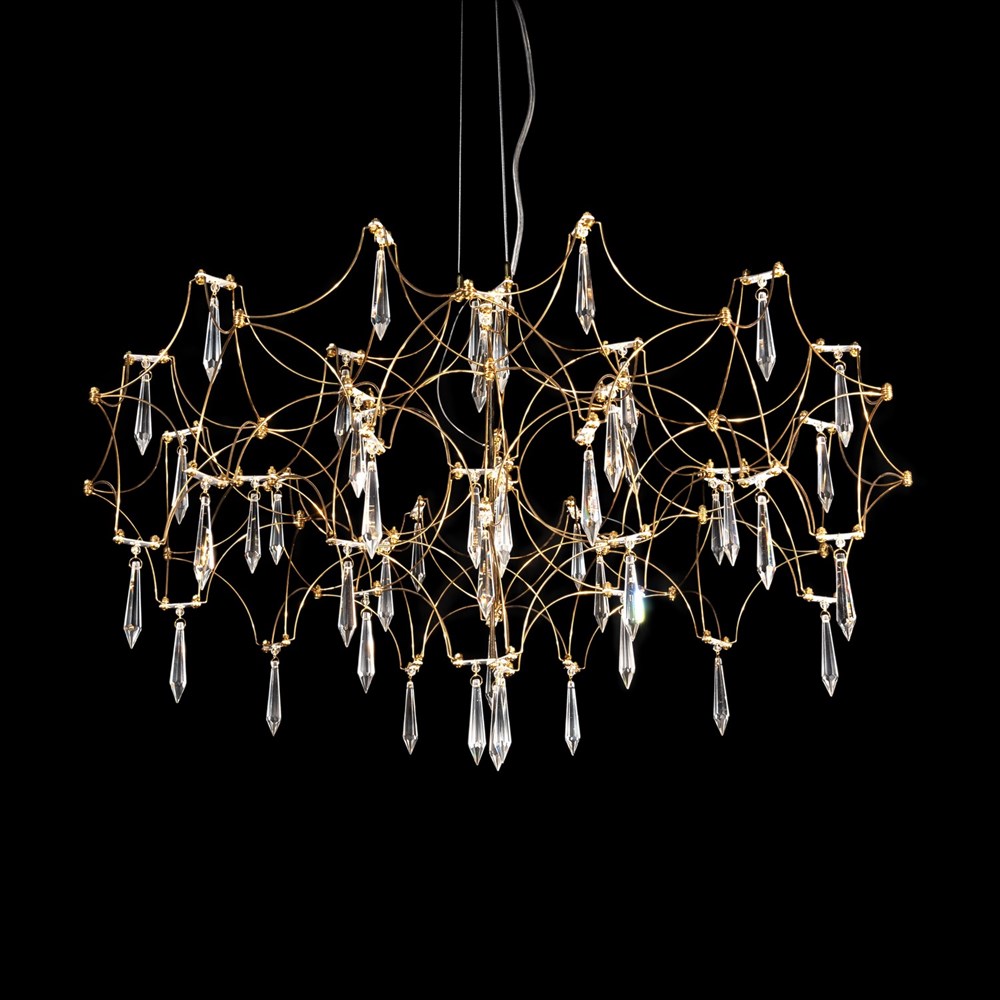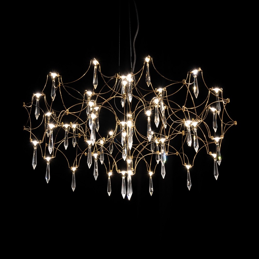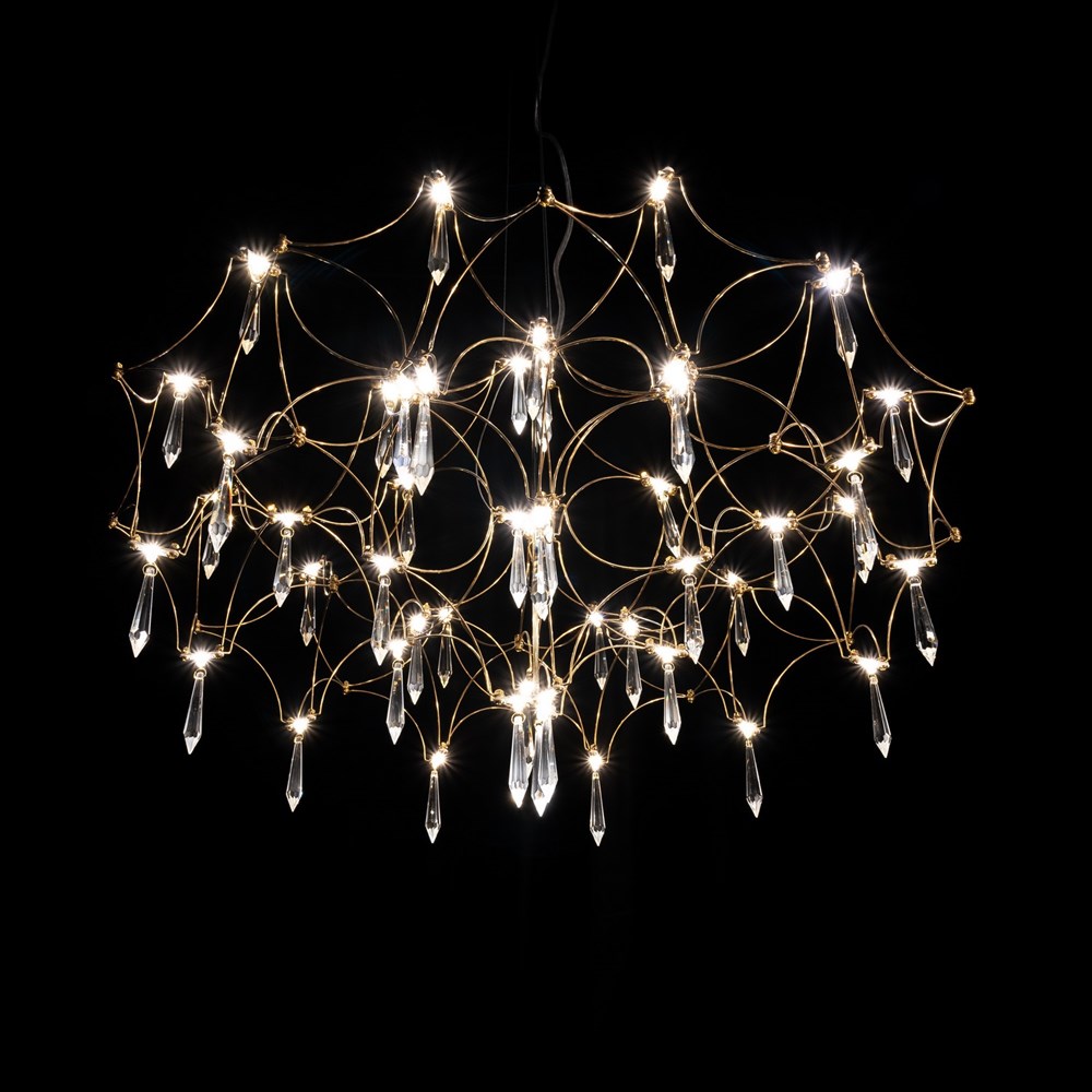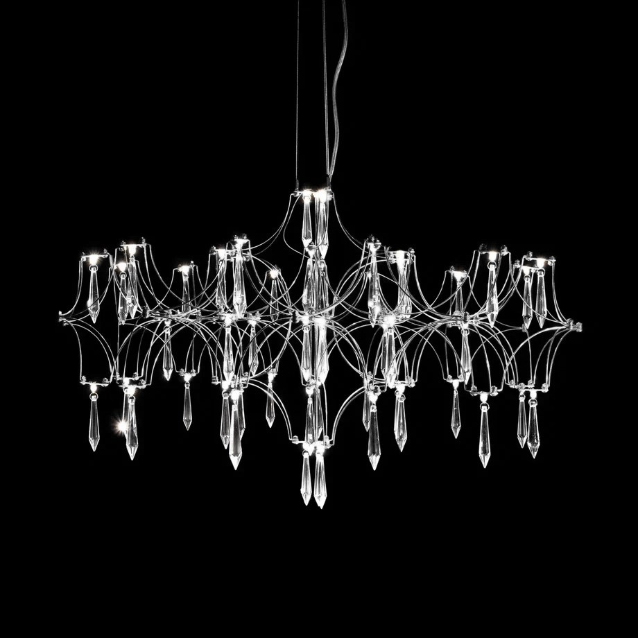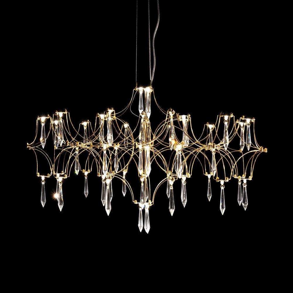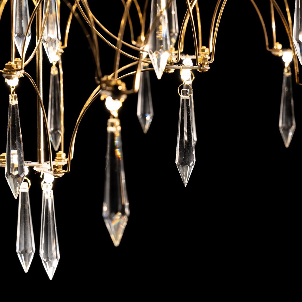 Дизайнерская люстра Emilia сразу рождает ассоциации с королевской роскошью. Обилие сверкающих подвесок из стекла или хрусталя создает ощущение праздника. Замысловатые переплетения изогнутых элементов каркаса смотрятся одновременно просто и необычно. Повторяя традиционный дизайн классических люстр, подвесной светильник выглядит воздушным, легким за счет использования тонких прутков нержавеющей стали. Подвески изготавливаются из прозрачного, дымчатого или радужного стекла, либо хрусталя: можно выбрать при заказе. Диаметр и высота светильника могут варьироваться по желанию покупателя. Модель гармонично смотрится в классическом, неоклассическом и современном интерьере.