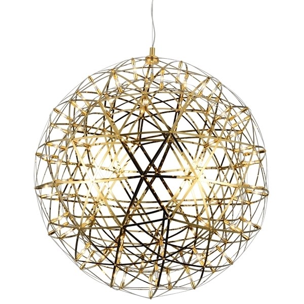 Raimond Sphere золото представляет собой стальную сферу, на первый взгляд, выполненную в виде беспорядочного сплетения нитей. Но при включении именно благодаря этому и формируется неповторимый рисунок светотени, напоминающий космическое пространство.