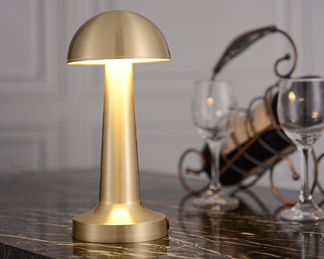 Лампа из металла в форме гриба. Округлая форма и мягкий свет этой настольной лампы создают теплую и уютную атмосферу.